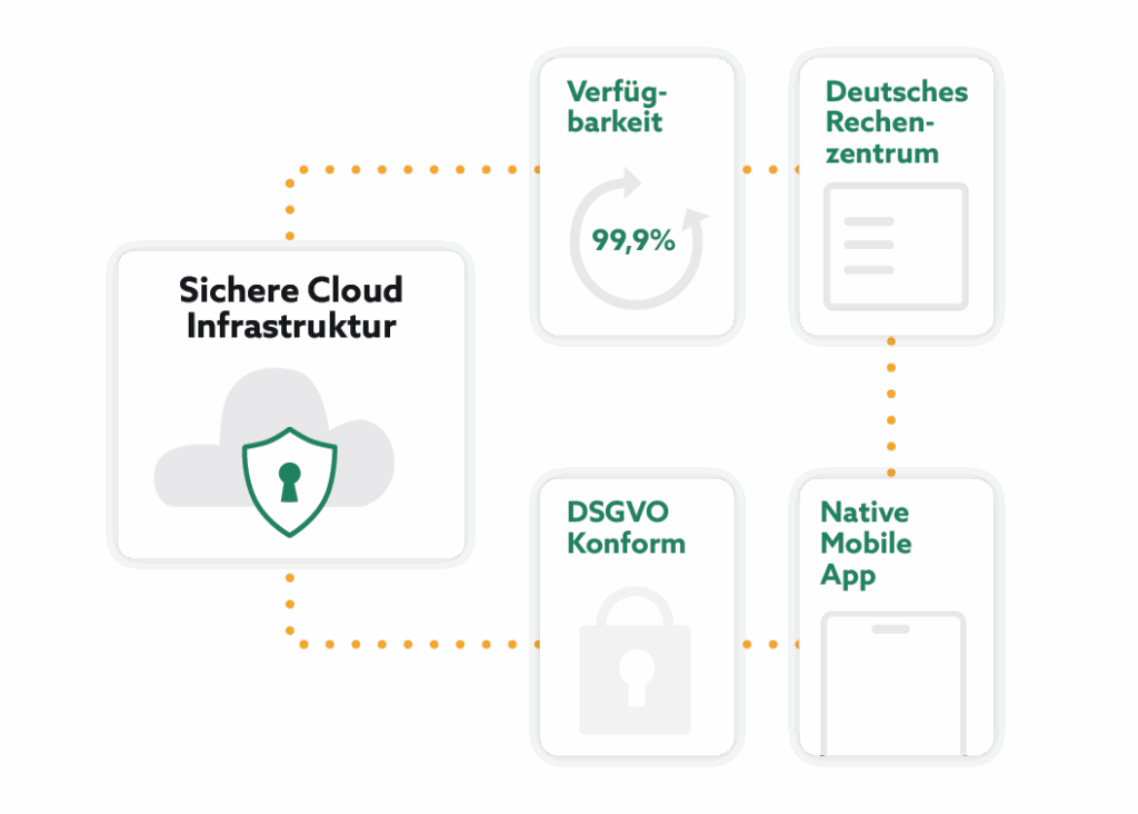 Hochverfügbare Cloud-Infrastruktur in deutschen Rechenzentren mit höchsten organisatorischen sowie technologischen Sicherheitsstandards. Umfassende Verschlüsselung und vollständige DSGVO-Konformität gewährleisten maximalen Schutz Ihrer Unternehmensdaten.