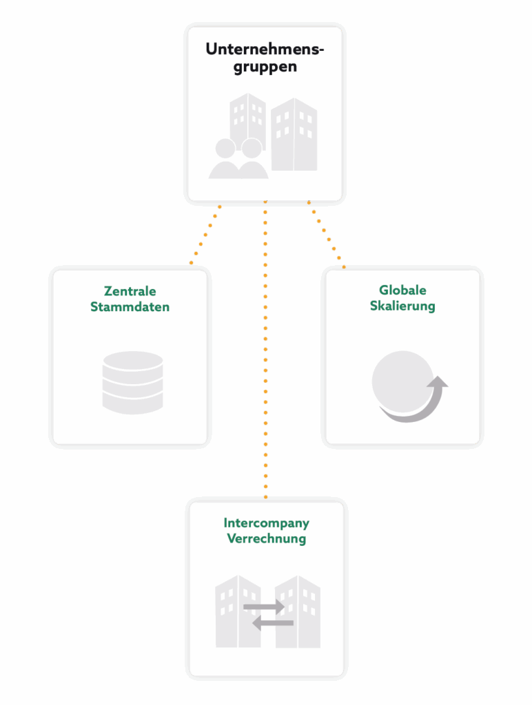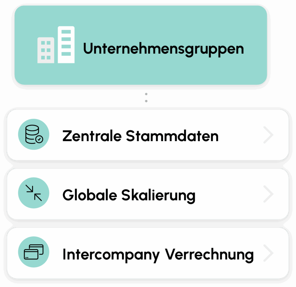 Verwalten Sie komplexe Unternehmensstrukturen effizient. Zentrale Stammdaten, Intercompany-Verrechnungen und globale Skalierungsmöglichkeiten.