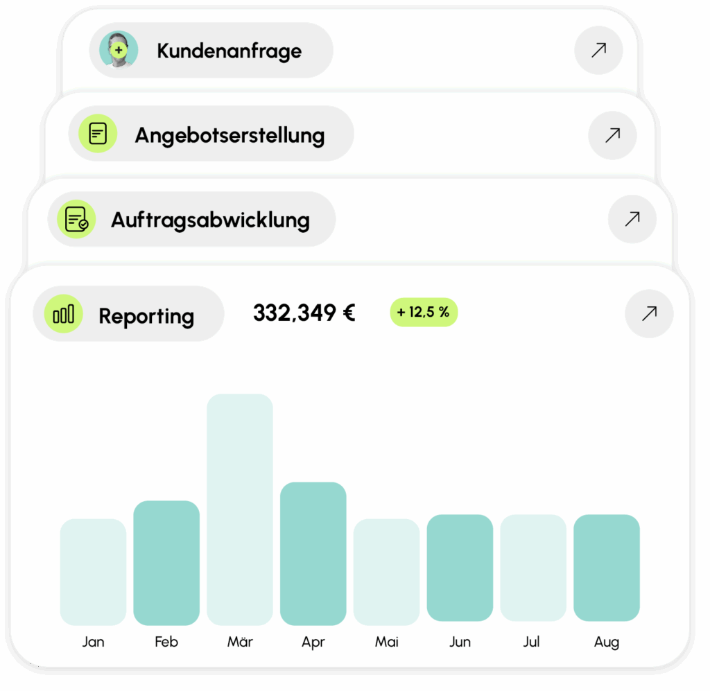 Verwalten Sie Ihre kompletten Kundenbeziehungen zentral und effizient. Von der ersten Anfrage über die Angebotserstellung bis zur Auftragsabwicklung behalten Sie jederzeit den Überblick über alle Verkaufschancen und Projekte.